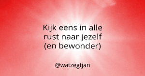 Ik ben Jan Monster, o.a. blogger bij Wat zegt Jan. In mijn blogs ben ik open en zoek ik de nuance. Ik onderzoek wie ik ben en hoe ik verander. Wil jij mijn zoektocht niet missen, volg dan de Wat zegt Jan-pagina’s op WordPress.com, LinkedIn, Twitter, Instagram en Facebook. Wil je een keer met mij van gedachten wisselen of een afspraak maken voor een coaching, dan kan je hier contact met me opnemen.
