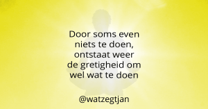 Ik ben Jan Monster, o.a. blogger bij Wat zegt Jan. In mijn blogs ben ik open en zoek ik de balans. Ze zijn o.a. geïnspireerd door mijn reis tot yogaleraar. Wil jij mijn zoektocht niet missen, volg dan de Wat zegt Jan-pagina’s op Instagram, Facebook, LinkedIn, Twitter en WordPress.com, Wil je een keer samen met mij kijken om te accepteren wat is of te ontspannen, dan kan je hier contact met me opnemen.