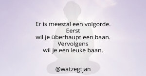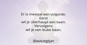 Volgens mij kan willen niet altijd. Ik zie heel wat twintigers starten met werken. Eerst willen ze iets van werk. Wat voor werk precies is vaak niet belangrijk. Dan willen ze in plaats van een flexibel contract een vast contract. En nadat ze dat hebben, gaat vaak pas de inhoud van de baan spelen. Dus mensen die kunnen zeggen dat ze willen werken, voelen de urgentie van brood op de plank vaak minder. Het zou kunnen dat ze verlicht zijn. Het kan ook zijn dat zij in de luxe positie zitten dat zij zich over geld niet druk hoeven te maken. Op basis van wat ik zie, weet ik dat de meeste mensen toch in eerste instantie werken om geld te verdienen. Pas als dat is gelukt, wordt er gekeken of het werk leuk is.