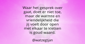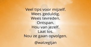 Ik ben Jan Monster, o.a. blogger en coach bij Wat zegt Jan. Wil je verder praten over dit blog, dan kan je hier contact met me opnemen. Wil jij mijn zoektocht naar mijzelf niet missen, volg dan de Wat zegt Jan-pagina’s op Instagram, Facebook, LinkedIn, Twitter en WordPress.com.