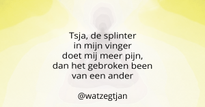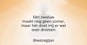 Ik ben Jan Monster, o.a. blogger en coach bij Wat zegt Jan. Wil je verder praten over dit blog, dan kan je hier contact met me opnemen. Wil jij mijn zoektocht naar mijzelf niet missen, volg dan de Wat zegt Jan-pagina’s op Instagram, Facebook, LinkedIn, Twitter en WordPress.com.