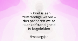 Waarschijnlijk heb ik daar dan ook mijn grootste opvoedmissers gemaakt, door zo betrokken bij hen te zijn en door op hen mijn eigen verlangens en angsten te projecteren. Hierdoor zal ik dingen hebben gedaan die beter voor mij waren dan voor hen, waarbij ik er toen heilig van overtuigd was dat ik het voor hen deed. Ik kan niet teruggaan in de tijd om het anders te doen, dus laat ik in de toekomst proberen te kijken naar wat zij nodig blijken te hebben en hen daarbij te helpen – als ze dat willen. Want uiteindelijk is er maar één iemand die beslist over hun leven en dat zijn zij zelf.