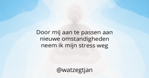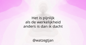 Zoals je eerder hebt kunnen lezen klopt sinds mijn hersenletsel mijn zelfbeeld en daarmee het verhaal dat ik over mijzelf heb niet meer. Mijn verstoorde zelfbeeld veroorzaakt pijn. Het begint ermee dat ik dus moet aanvaarden dat ik een beeld van de werkelijkheid had, dat niet meer juist is. Ik moet dat beeld aanpassen, zodat ik de werkelijkheid kan nemen zoals die is. Mijn pijn en sores verdwijnen als ik maar niet krampachtig vast blijf houden aan oude beelden die niet meer kloppen. Het aloude “wat is, is”, klopt dus echt. Alleen doordat ik toch graag vast wil blijven houden aan mijn oude beeld creëer ik stress bij mijzelf. Die stress is snel weggenomen als ik mijn (zelf)beeld gewoon aanpas.