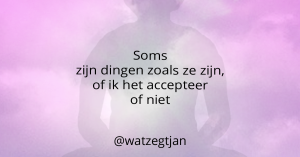 Ik heb moeite met het woord accepteren. Ook accepteren is weer een voorbeeld van de schijn dat ik met mijn geest iets magisch kan doen waardoor ik controle heb over mijn (negatieve) gedachten, gevoelens en emoties en dat het mijn mentale werkelijkheid wel even zal veranderen als ik de kracht van accepteren maar inzet. Maar als meditatie mij iets heeft getoond, dan is het wel dat ik niets kan doen aan het opkomen van gedachten, sensaties en gevoelens. Ze komen, ze zijn en ze gaan of ik ze nou accepteer of niet. Gelukkig kwam er een psycholoog op mijn pad die mij leerde dat ik de werkelijkheid moet nemen zoals die is. Dit heeft mij veel lucht gegeven. Gevoelens zijn zoals ze zijn en ik hoef er niets mee. Ik hoef ze niet te aanvaarden of weg te duwen. Net als tijdens een meditatie kan ik ze laten bestaan zonder dat er enige actie van mij nodig is. Ook gedachten en emoties blijken meestal zo weer weg te zijn en daarna komt er dan vanzelf weer wat anders waar ik ook weer niets mee hoef.