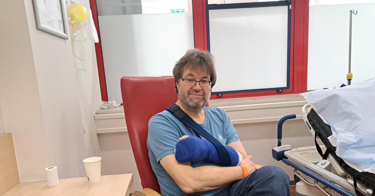 Mijn slimme horloge begon onmiddellijk waarschuwingssignalen af te geven. Ik keek ernaar en deze vertoonde de volgende zin: “Het lijkt erop dat je flink gevallen bent. Zal ik de hulpdiensten alarmeren?“ Ik drukte op de knop dat dat niet nodig was. Ik stond op en ging mijzelf op beschadigingen controleren, net als ik had geleerd bij de val-training in het revalidatiecentrum. Ik zette de camera van mijn telefoon aan omdat ik voelde dat ik een dikke lip had, maar gelukkig kon ik zien dat er niets aan mijn gezicht of bril mankeerde. Ook mijn knieën leken heel en mijn rechterhand was gevoelig maar was nog heel en ik kon hem helemaal goed bewegen. Niets aan de hand dus. Ik kon gewoon verder lopen. Toch?