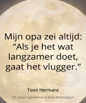 De vraag is of een kleinkind valt onder iets leuks of iets dat je moe maakt. Voor ik deze vraag beantwoord, wil ik terugblikken op wat ik eerder schreef over mijn rol als vader. Als tiener droomde ik al van het vaderschap en vanuit die wens heb ik zowel positieve als minder handige keuzes gemaakt in de opvoeding. Inmiddels besef ik diep dat kinderen hun eigen weg gaan en dat ik vooral moet kijken naar wat zij nodig hebben, in plaats van te handelen vanuit mijn eigen verlangens. Dit inzicht kwam weer bij me op toen ik hoorde van een oma die iedere dag een uur rijdt om haar kleinzoon te bezoeken. Ik begrijp haar verlangen, maar is dit goed voor haarzelf, haar kind of haar kleinkind? Hoewel ik geen definitief antwoord heb, probeer ik voortaan eerst uit te gaan van de wensen van mijn (schoon)kind en kleinkind. Nu ben ik immers zelf een ouder van een ouder geworden; dat is anders ouder zijn, maar mijn inzicht blijft hetzelfde.